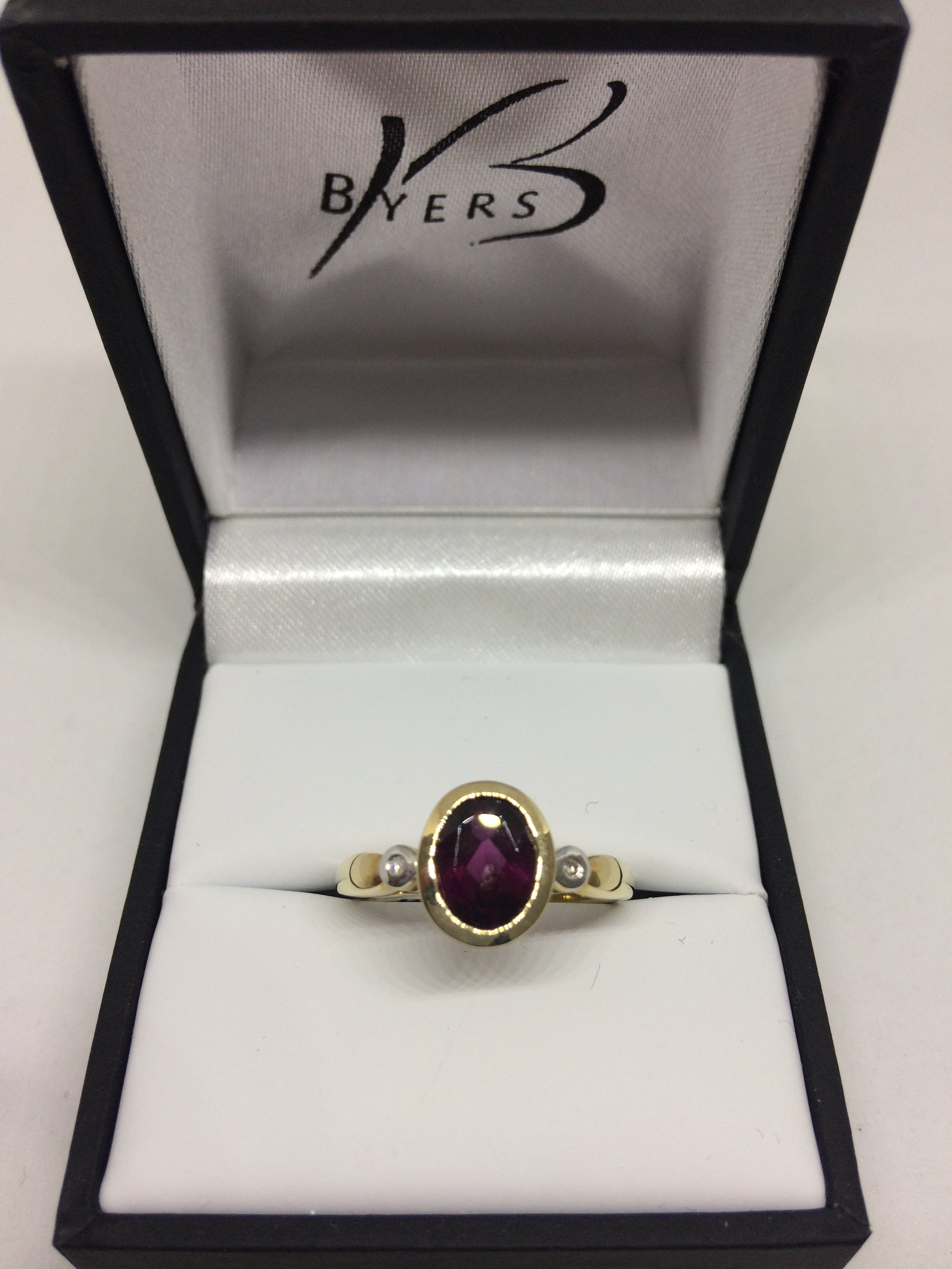 9ct Yellow Gold Rhodalite Garnet and Diamond Rub Over Style Dress Ring #