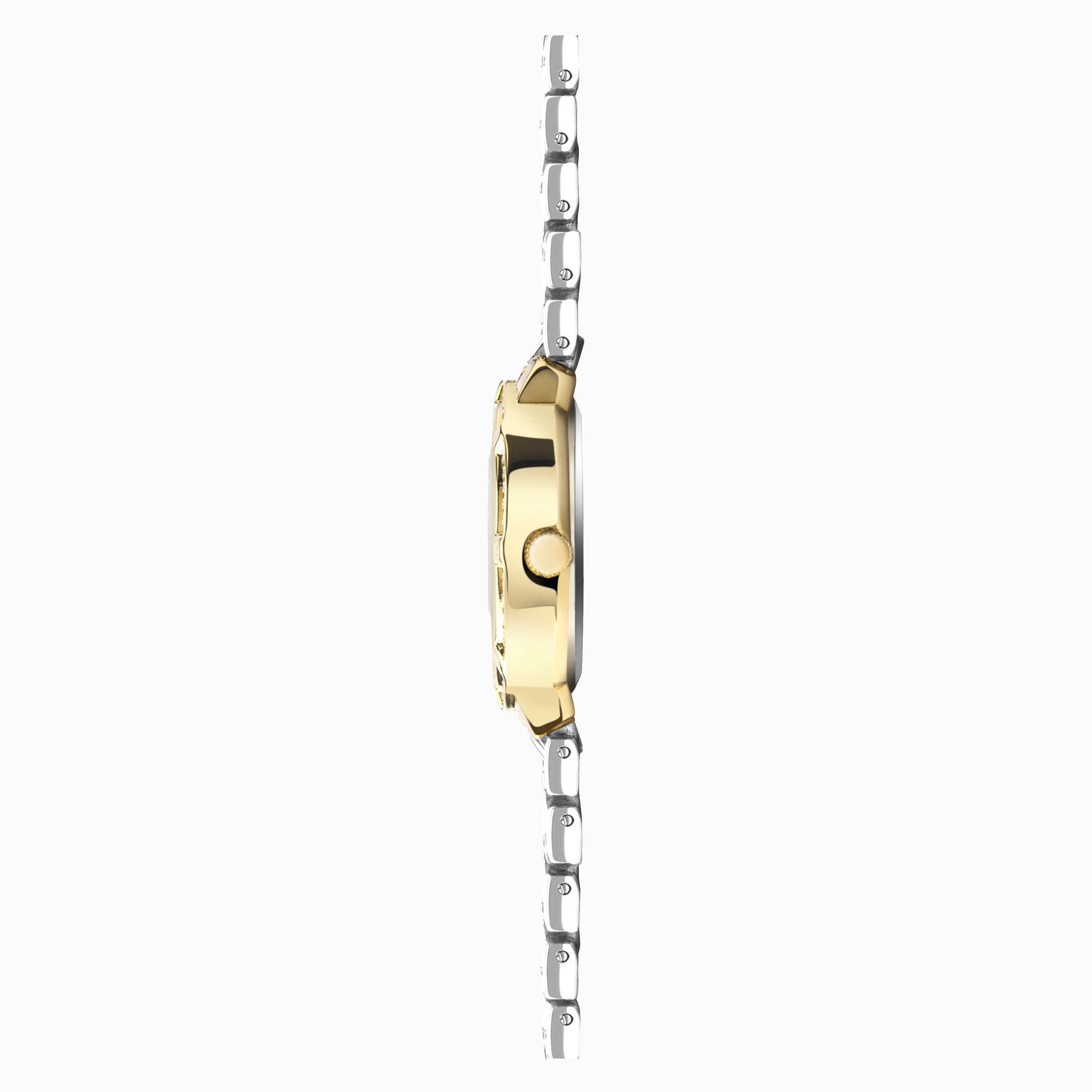 This timepiece features a round ionic plated two-tone stone set case enclosing a silver-white stone set sunray dial. The watch is fastened with a two-tone ionic plated gold and silver coloured bracelet.